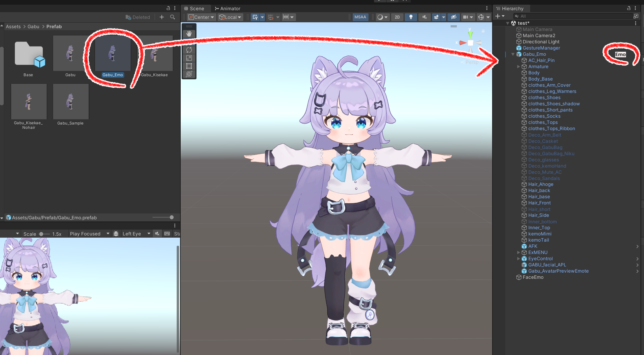 ②Gabu_EmoのプレハブをHierarchyに配置して「Emo」ボタンを押してください。