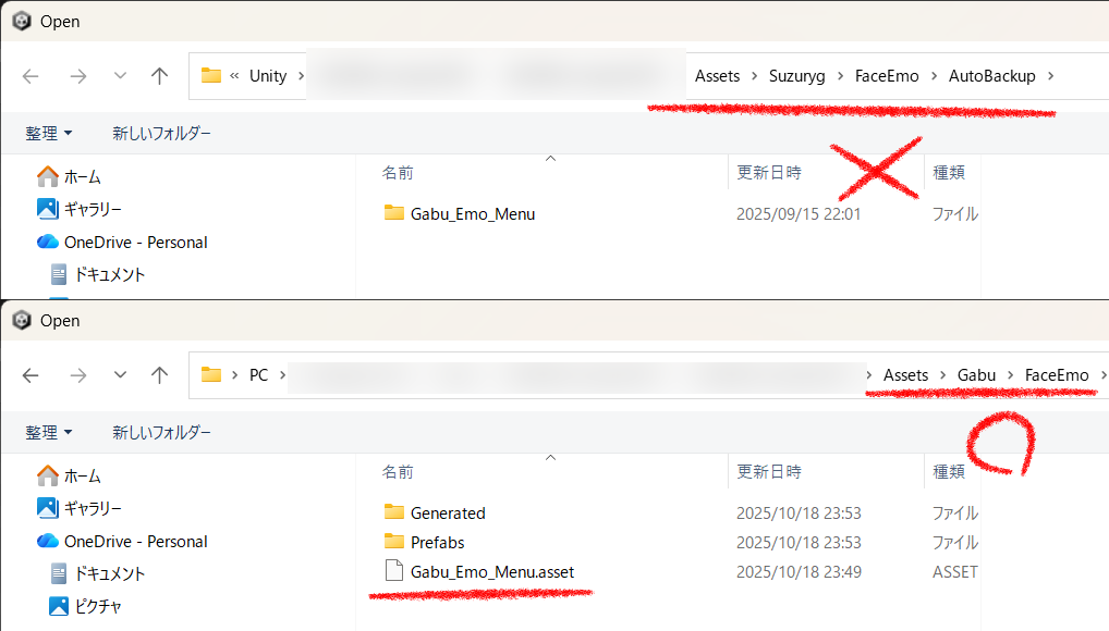 がぶをインストールした場所(例)Assets\Gabu\FaceEmoに移動して「Gabu_Emo_Menu.asset」を開いてください。