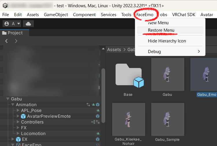 ⑤Unityの上部メニューの「FaceEmo」>Restore Menuをクリックしてください。