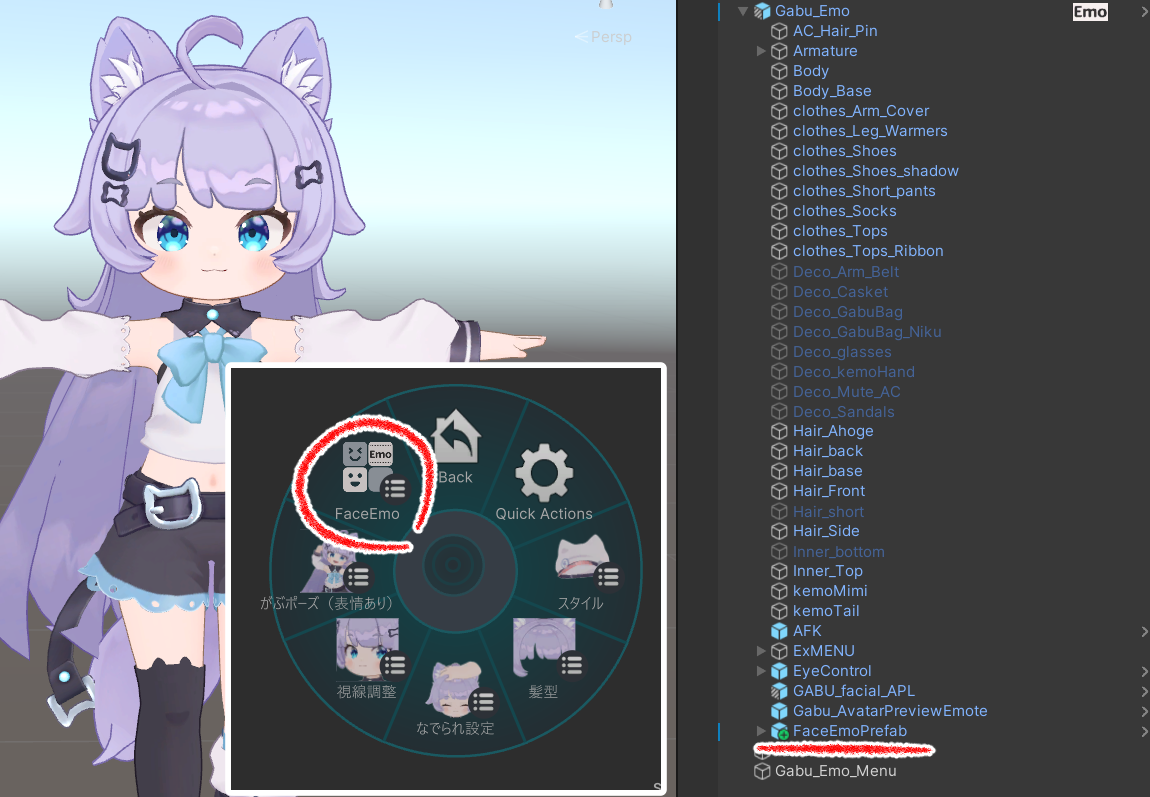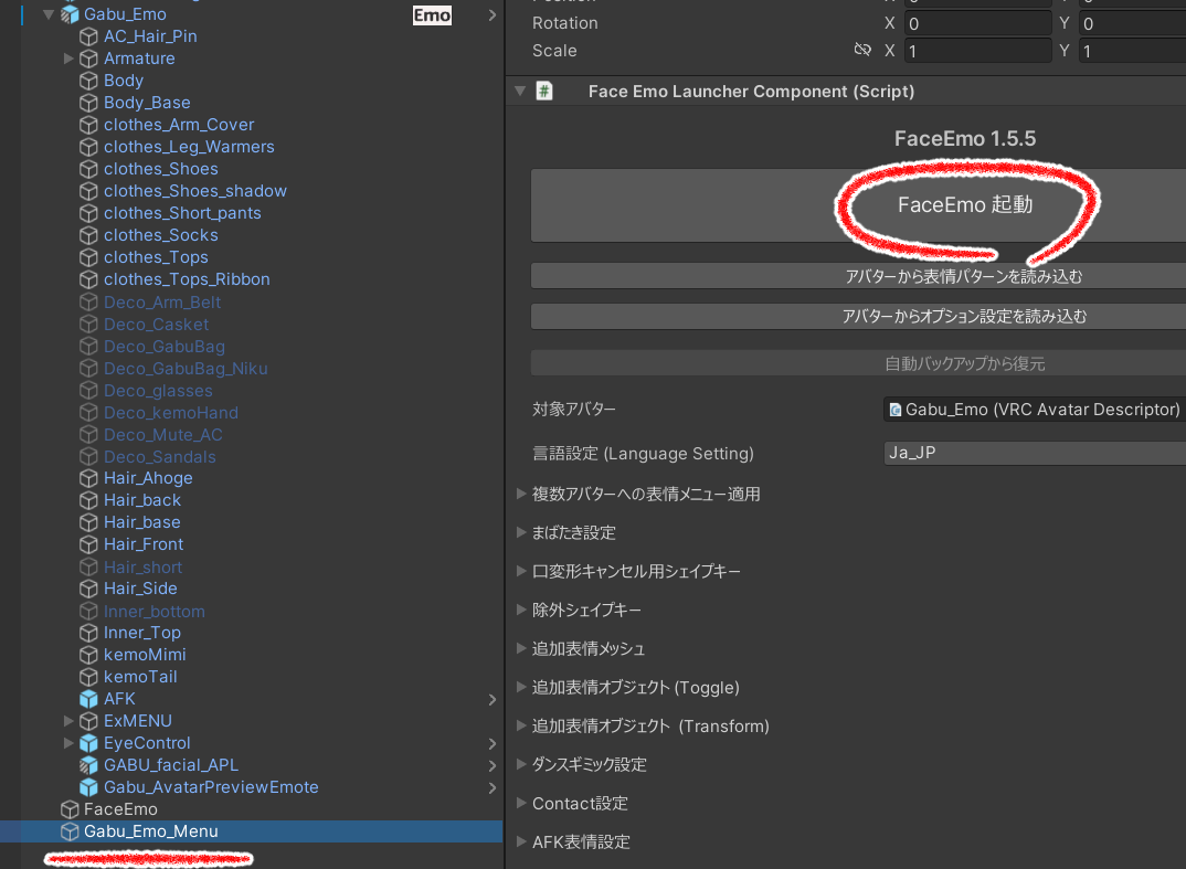 ⑦開いたらHierarchyに「Gabu_Emo_Menu」が追加されますのでクリックしてFaceEmoを起動してください。