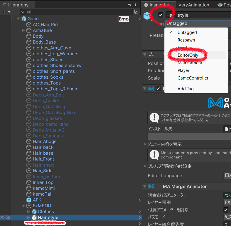 ③Tagを「EditorOnly」に変更