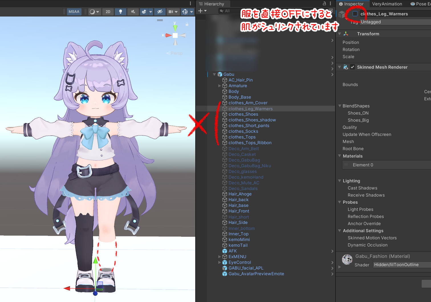一部のみお着換えの場合、ファッションのオブジェクトをオフにすると肌が無くなる場合があります。こちらはMAのメッシュカッターやシェイプチェンジャーを使用しており、そちらを解除しないと本体の体のシェイプキーをいじっても解決できません。